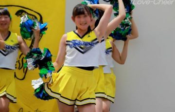 『冒頭は、※鉄**のチアです。全体的にチアの質が高く、人間ピラミッド、馬跳び、ラインダンスなど、壷を押さえたような演技が目白押しでした。また、このチームは踊りが圧倒的に多く、アクションはそれほど派手ではないものの、赤、オレンジ、白スコートの色とりどりのチアが代わる代わる登場し、終始観客を飽きさせませんでした。プラカードチアは立て膝ポーズで奥まで丸見えでした』