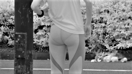 一人目のジョギング中に信号待ちのお姉さん、小ぶりですが、まん丸で柔らかそうなお尻でした。